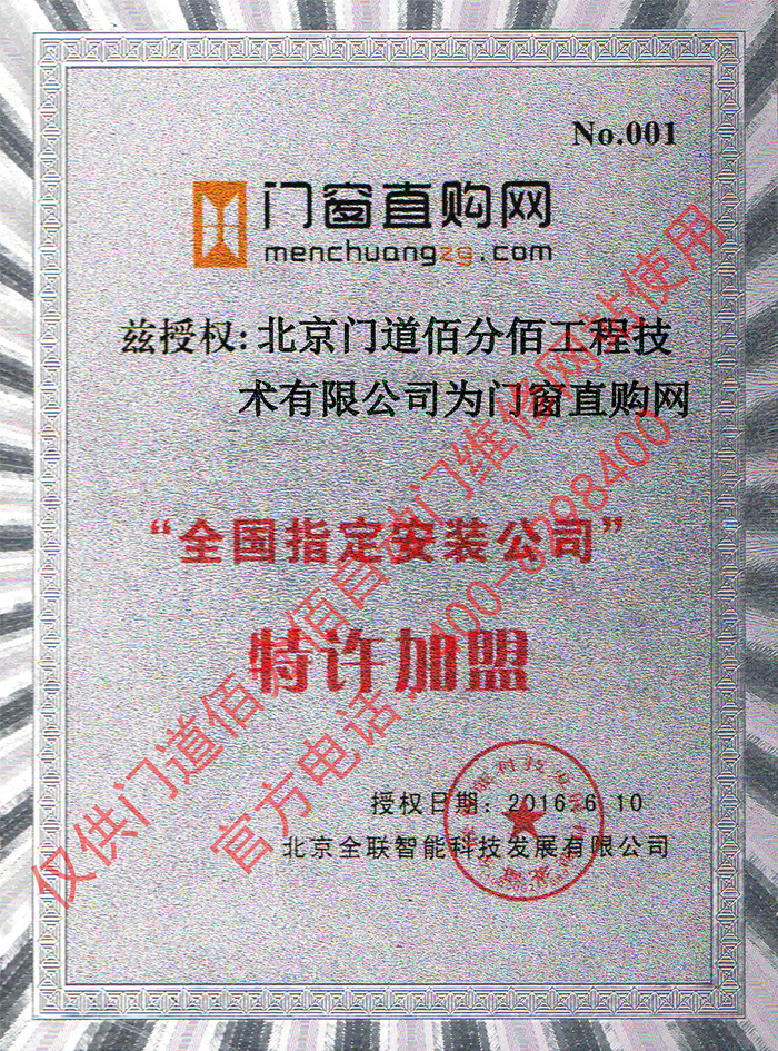 門窗直購網(wǎng)授權(quán)門道佰分佰為指定安裝公司證書